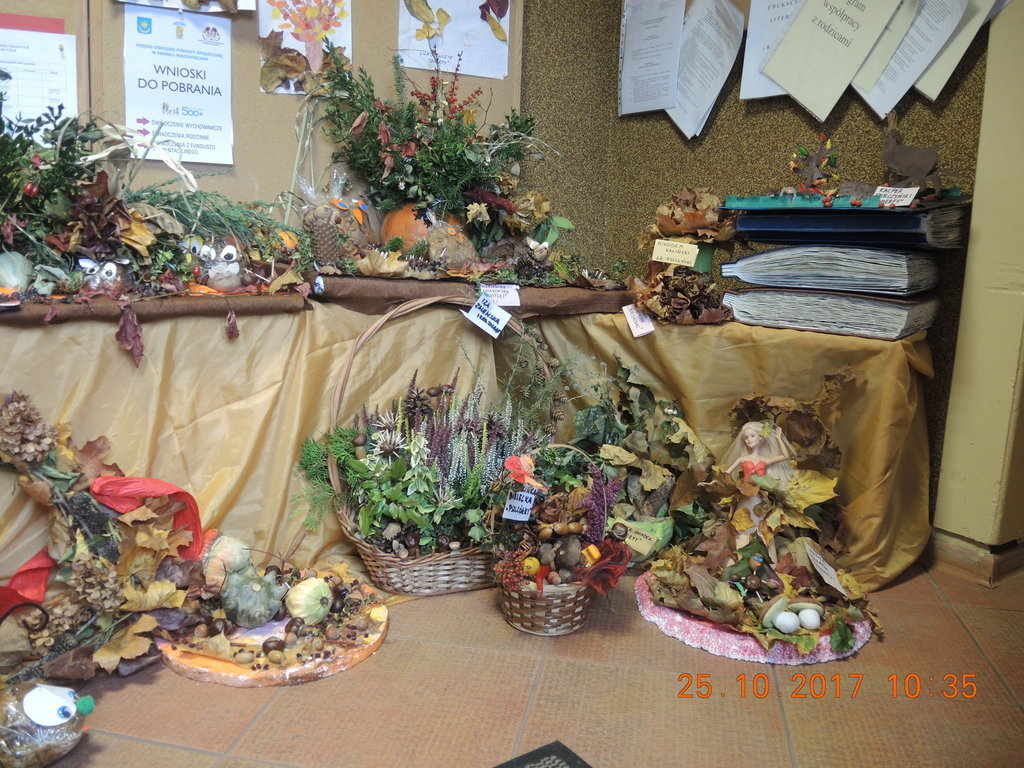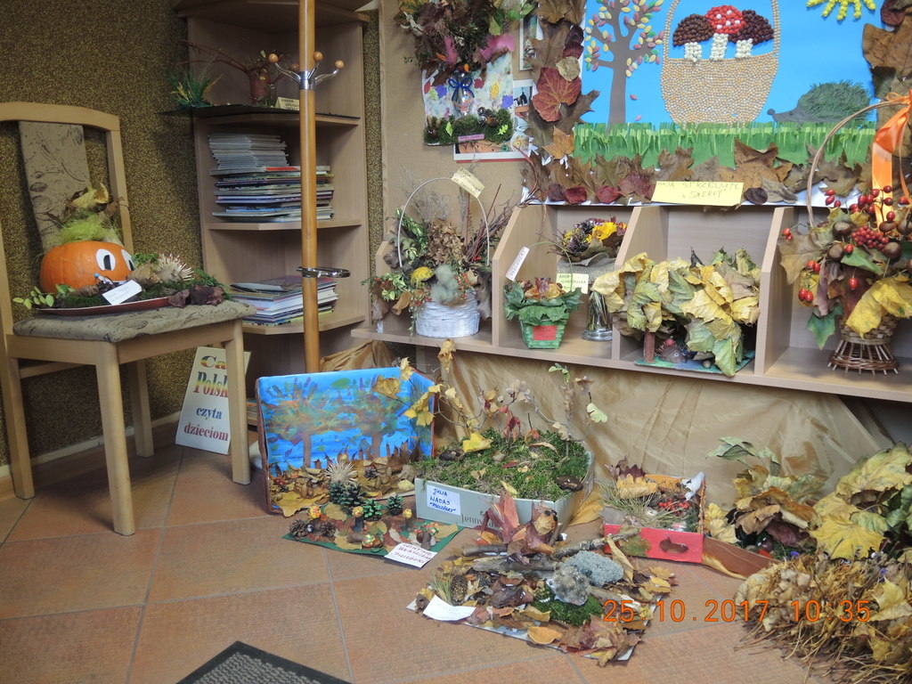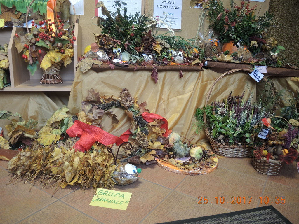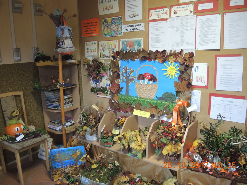Na konkurs wpłynęło 35 prac wykonanych z różnorodnych tworzyw przyrodniczych (warzyw, owoców, liści, kasztanów, żołędzi, itp.). Najwięcej radości dostarczyła dzieciom wspólna praca z rodzicami i rodzeństwem przy tworzeniu konkursowych eksponatów, które można było obejrzeć na wystawie zorganizowanej w holu naszego przedszkola .