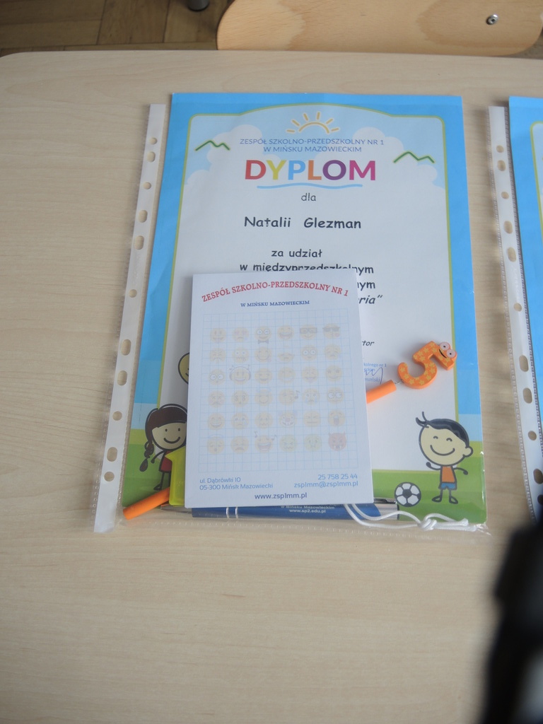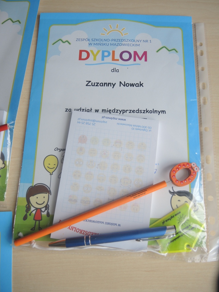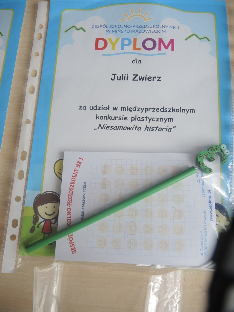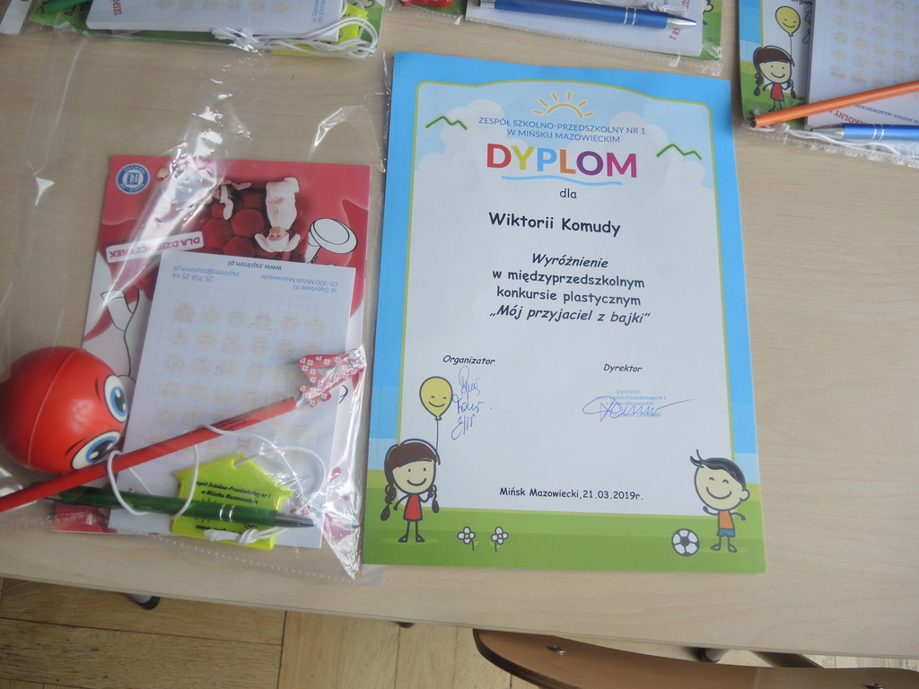 Dzieci z grupy " Pszczółki" i " Smerfy" wzięły udział w konkursie plastycznym zorganizowanym przez Zespół Szkolno-Przedszkolny Nr1 w Mińsku Maz. pt: "Mój przyjaciel z bajki". Celem konkursu było rozwijanie aktywności i kreatywności plastycznej dzieci. Wśród wielu nadesłanych prac wyróżniona została praca Wiktorii K. z gr. "Pszczołki" przedstawiająca bohatera bajki "Minionki". Za udział w konkursie pamiątkowe dyplomy otrzymały również: Natalka G., Julia Z., Alicja Z., Zuzia N. z gr. "Smerfy".