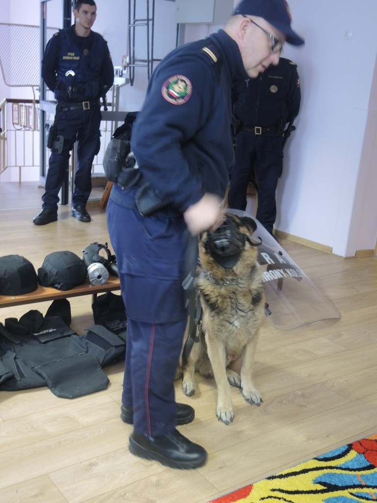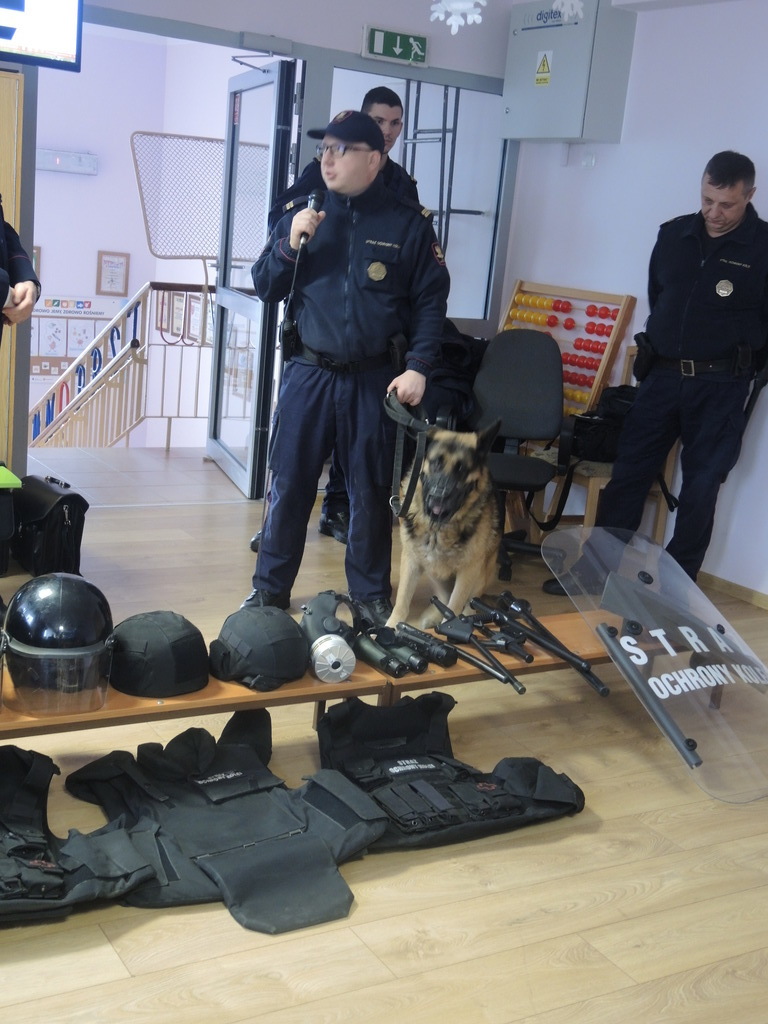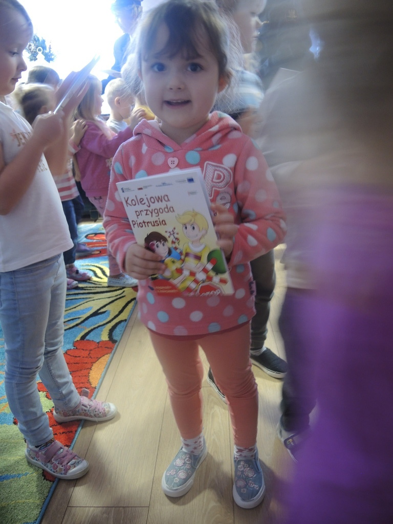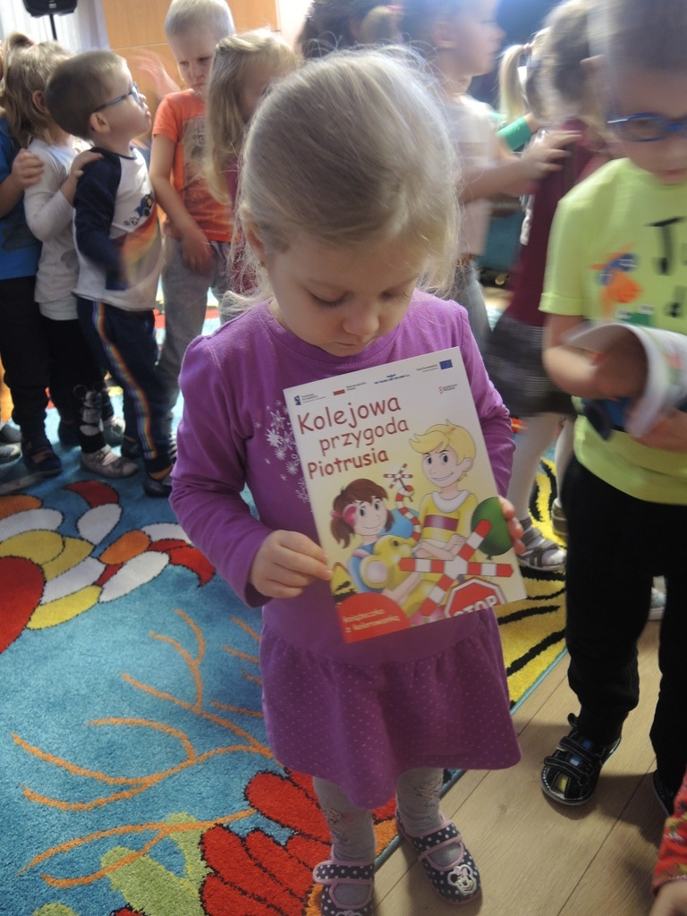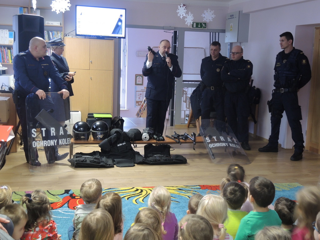 Przedszkolaki dowiedziały się w jaki sposób zachować bezpieczeństwo na przejazdach kolejowych, na dworcach i w pociągu. Poznały znaki Stop, Krzyż św. Andrzeja i czerwone pulsujące światła. Pracownicy SOK zaprezentowali nam swoje umundurowanie oraz wyposażenie: kamizelkę kuloodporną, kask oraz kajdanki . Oczywiście chłopców najbardziej zainteresowały kajdanki. Odbył się również pokaz umiejętności wyszkolonego psa, owczarka niemieckiego Dzieci obejrzały filmy edukacyjne na temat zasad bezpiecznego zachowania się w pobliżu torów. Na zakończenie otrzymaliśmy upominki promujące akcję, m.in. książeczkę pt. „Kolejowa przygoda Piotrusia”.