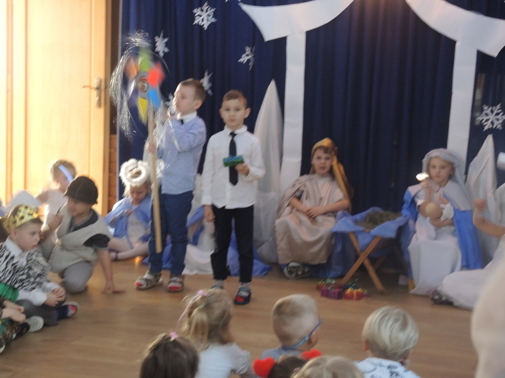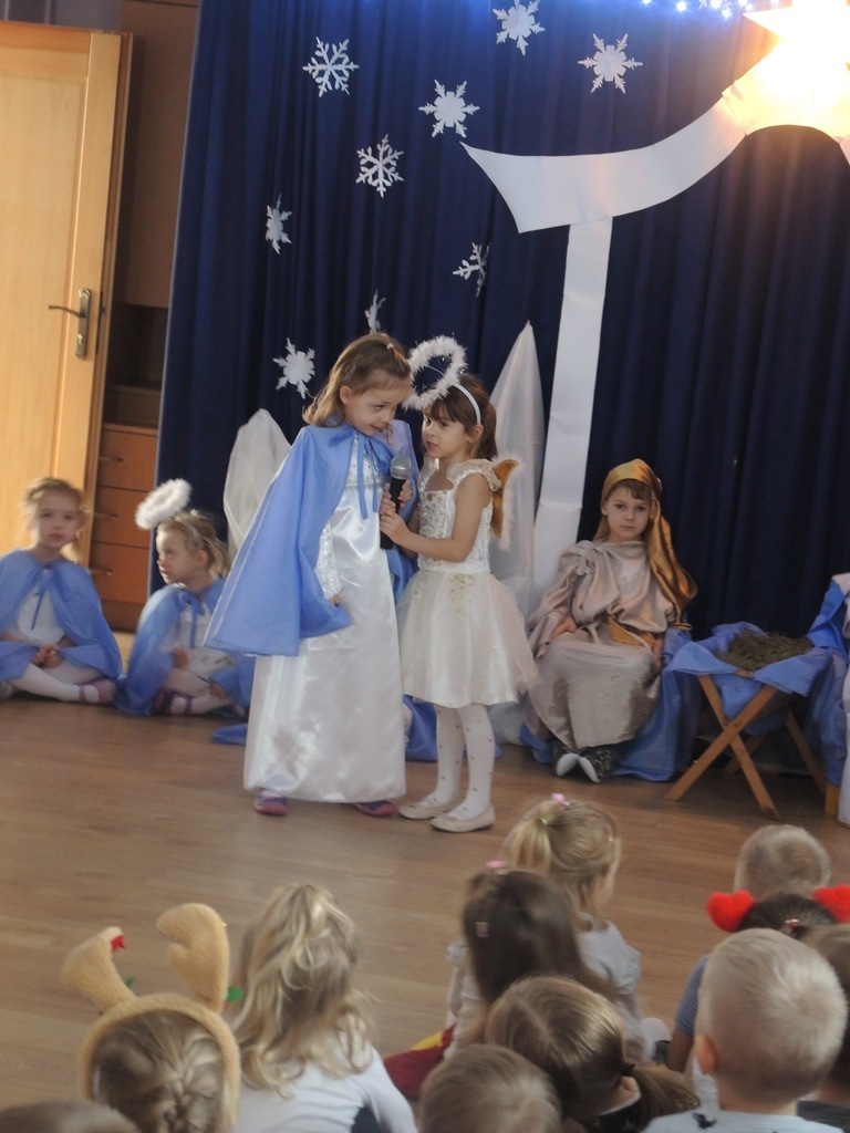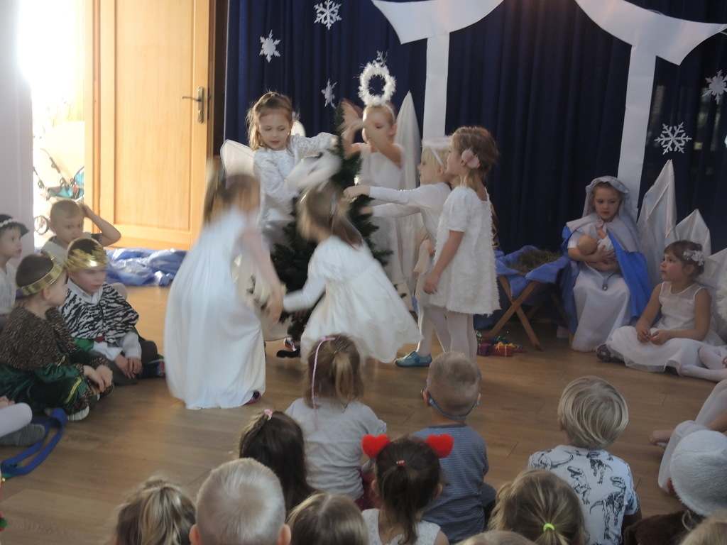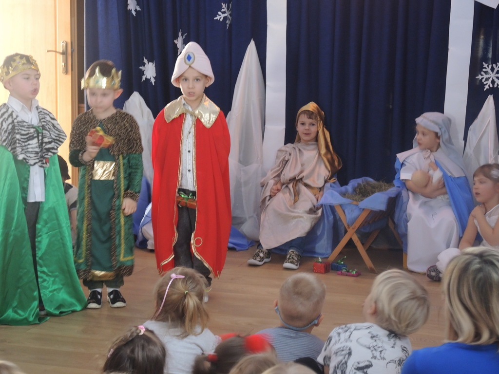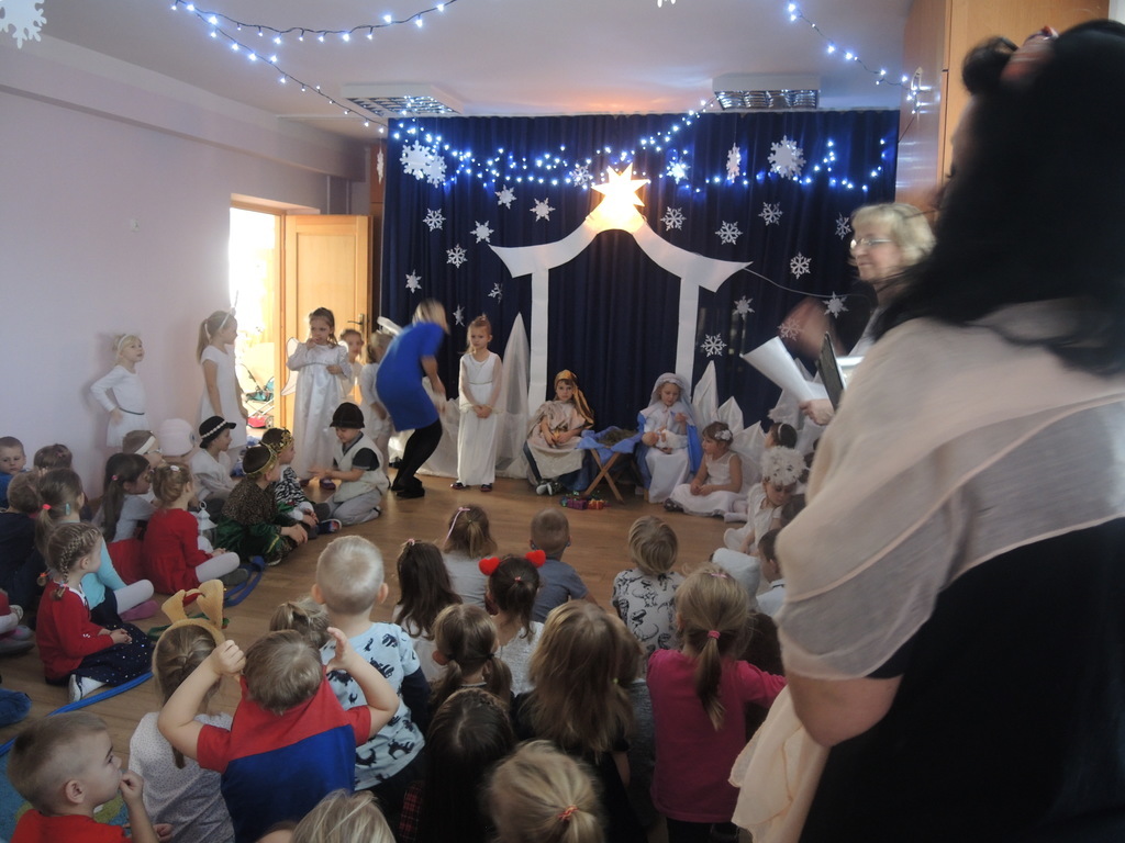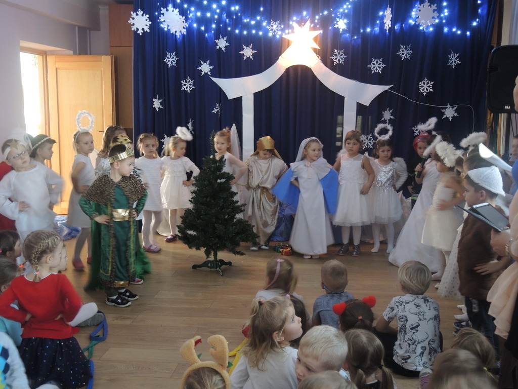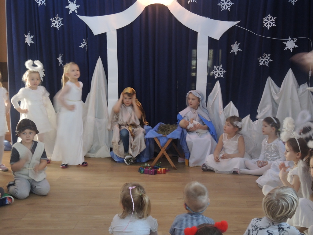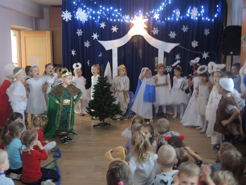 Aby podkreślić wyjątkowy charakter tych świąt, już tradycyjnie jak co roku w naszym przedszkolu odbyły się jasełka w wykonaniu dzieci z grupy Smerfy. Przedszkolaki w przygotowanych kostiumach oraz w scenografii nawiązującej do Betlejem przedstawiły sceny narodzin Jezusa Chrystusa. Wśród śpiewu aniołów do żłóbka przybyli rozradowani i pełni werwy pastuszkowie. Nowo narodzonemu Dzieciątku, pokłony złożyli także Królowie. Inscenizacja przeplatana była pięknymi kolędami i pastorałkami.