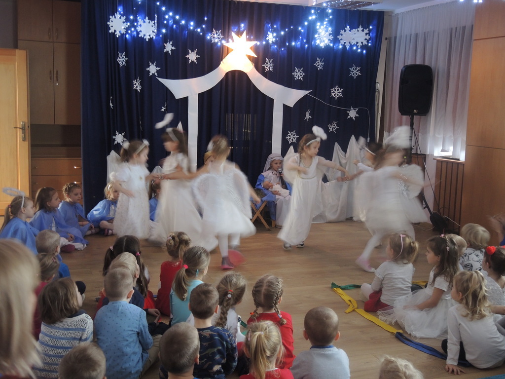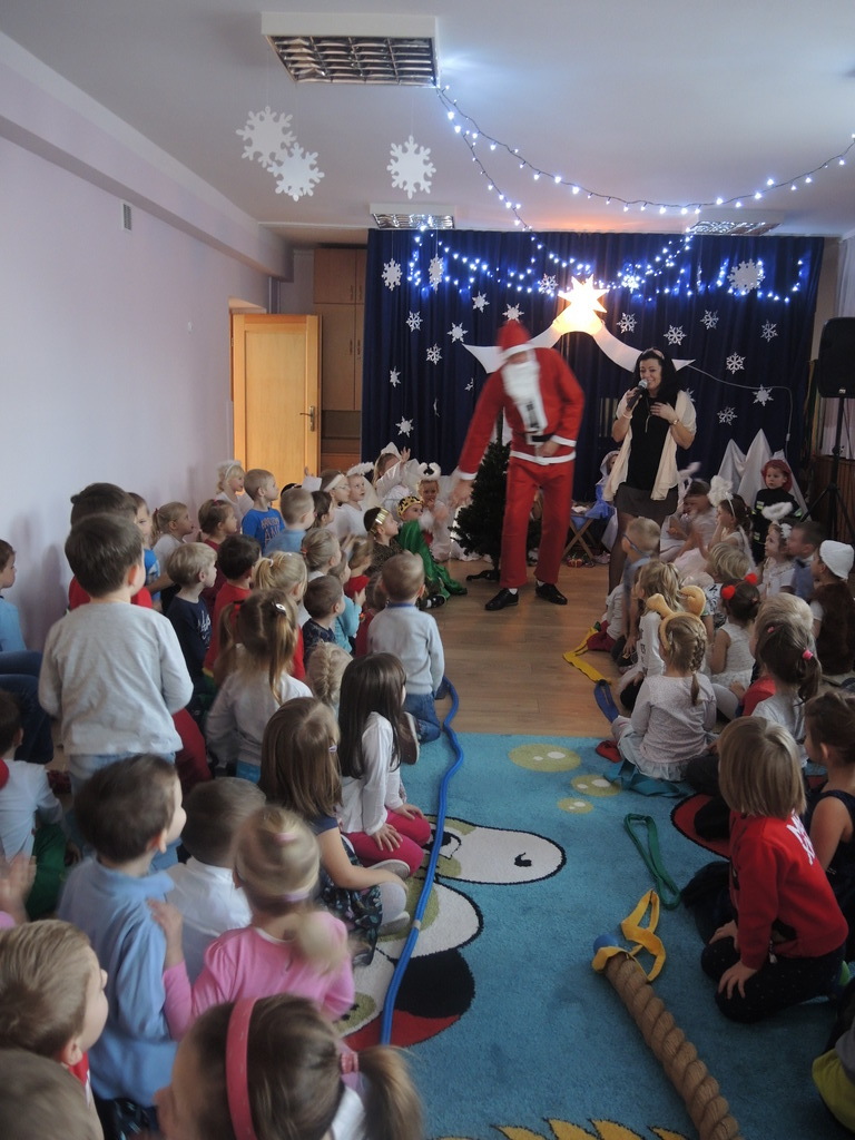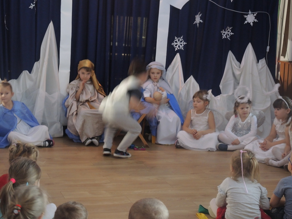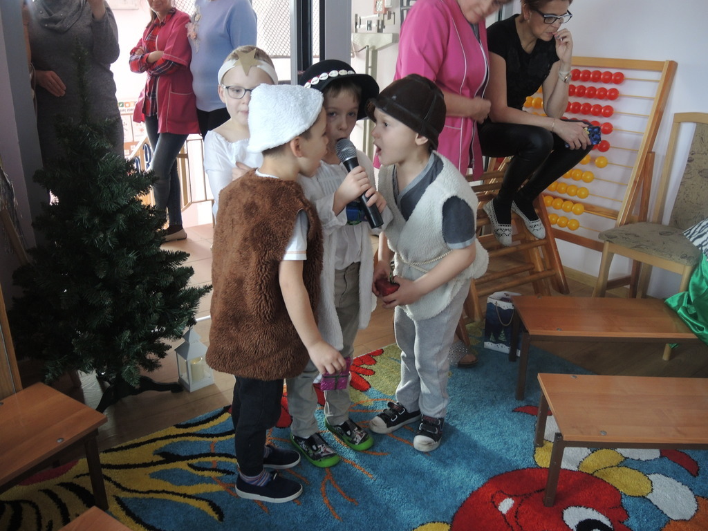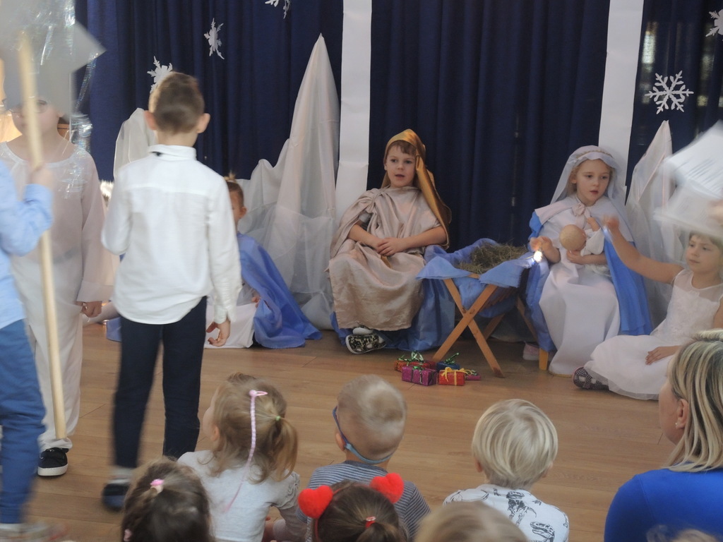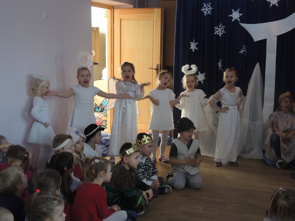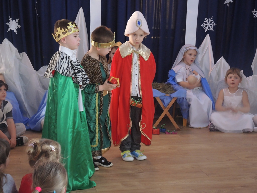 Aby podkreślić wyjątkowy charakter tych świąt, już tradycyjnie jak co roku w naszym przedszkolu odbyły się jasełka w wykonaniu dzieci z grupy Smerfy. Przedszkolaki w przygotowanych kostiumach oraz w scenografii nawiązującej do Betlejem przedstawiły sceny narodzin Jezusa Chrystusa. Wśród śpiewu aniołów do żłóbka przybyli rozradowani i pełni werwy pastuszkowie. Nowo narodzonemu Dzieciątku, pokłony złożyli także Królowie. Inscenizacja przeplatana była pięknymi kolędami i pastorałkami.